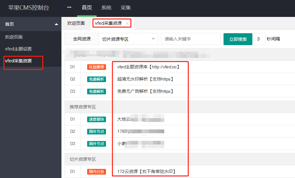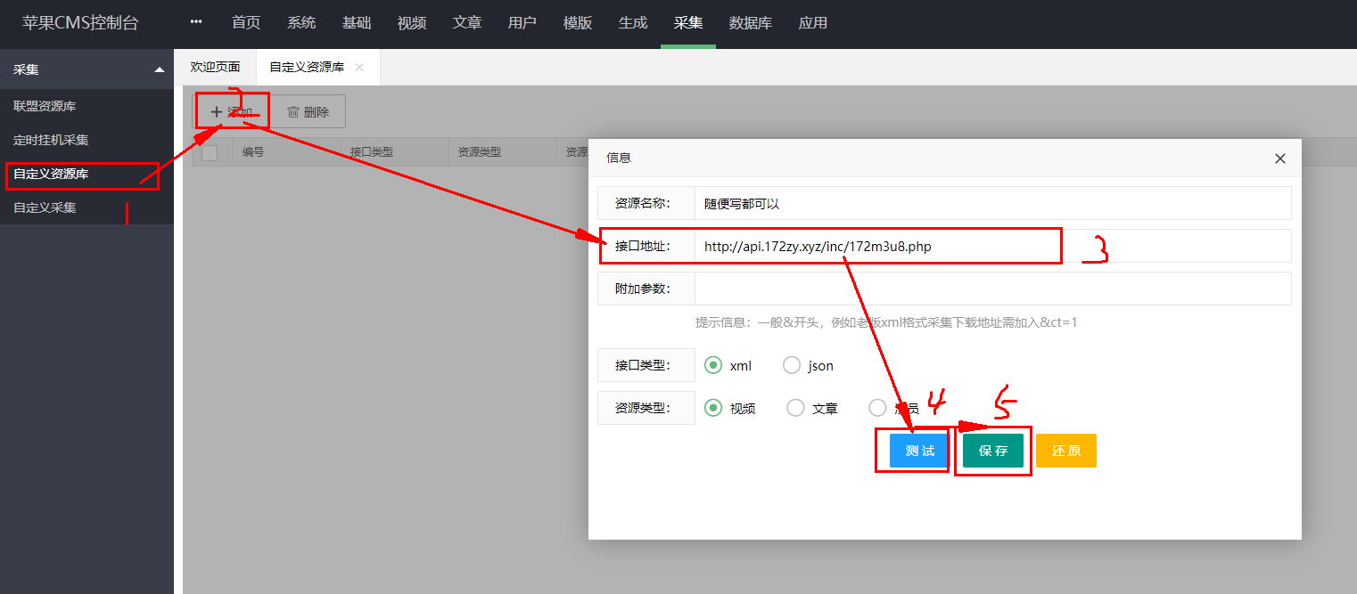 使用接口:自定义资源库-添加-输入接口地址-测试-保存【如果测试不存在“xml”格式那就选择“json”】
