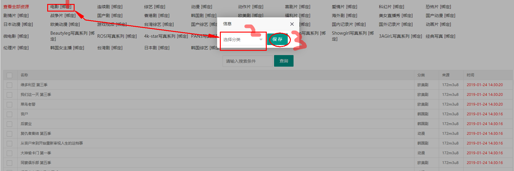 绑定目录:点击绑定-选择绑定分类-点击保存【注意:每个分类都需要一一绑定否则无法采集未绑定的分类】